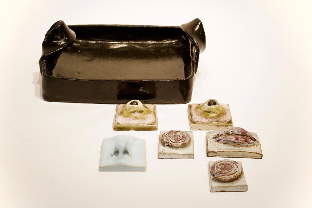 Parts of a face served on a tray.ceramic sculpture 8 in. by 11 in. by 2 in.
